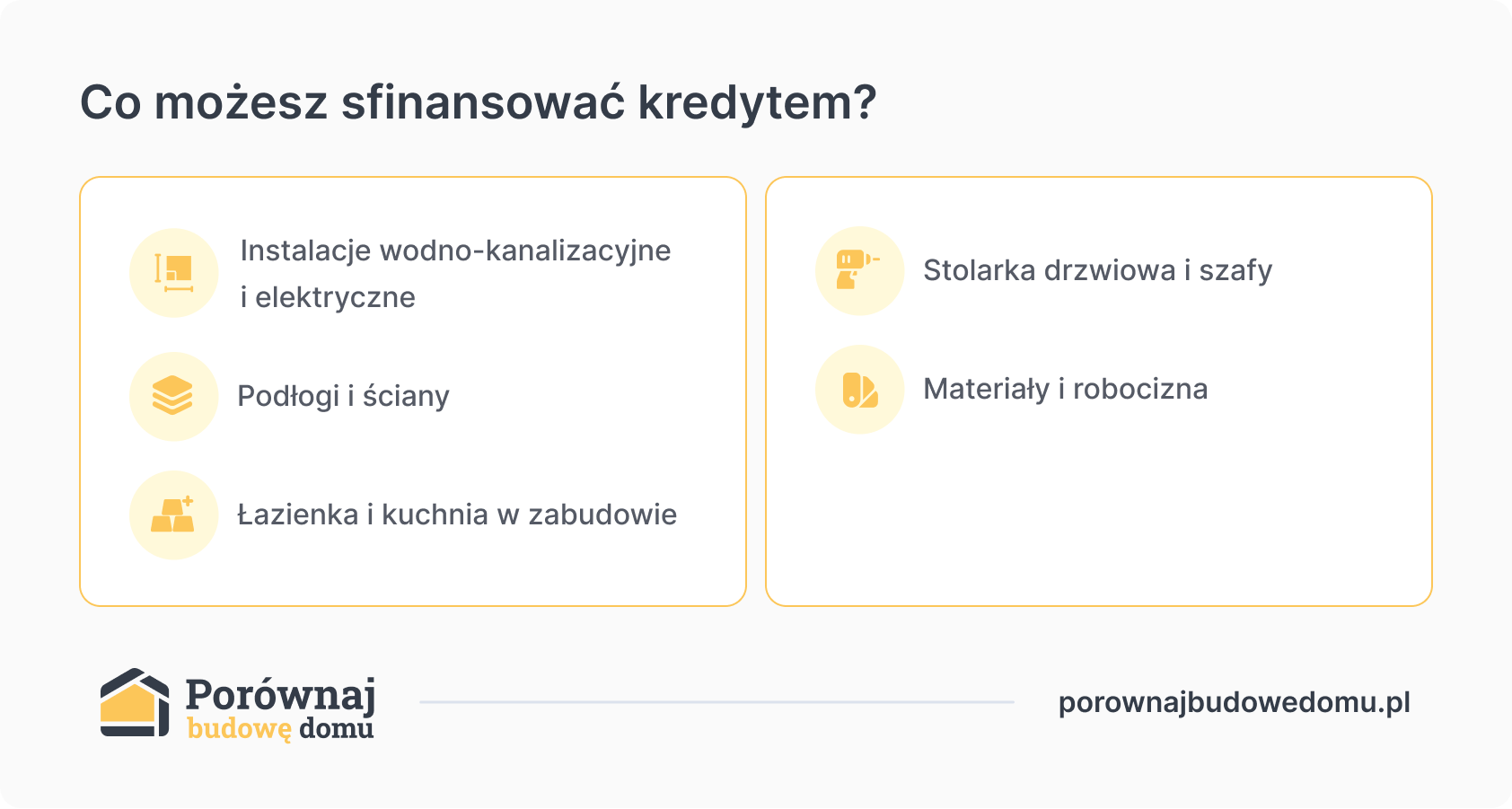3. Środki z kredytu można przeznaczyć na instalacje, prace wykończeniowe, stolarkę, wyposażenie łazienki i kuchni, materiały budowlane oraz wynagrodzenia ekip remontowych.